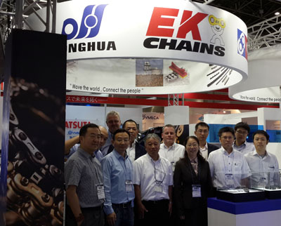 本屆展會上,東華集團聯(lián)合展出了中國、德國和日本三個生產(chǎn)基地制造的各種標(biāo)準(zhǔn)鏈、農(nóng)機鏈、齒形鏈、鋼廠輸送鏈、扶梯鏈、散物料輸送鏈、汽車工業(yè)鏈、食品工業(yè)鏈、木材加工鏈、污水處理設(shè)備鏈、加工中心刀庫鏈、焊接彎板鏈,帶密封圈的摩托車鏈條等公司優(yōu)勢產(chǎn)品,吸引了來自全球絡(luò)繹不絕的客戶參觀與洽談。集團總工程師葉斌、副總經(jīng)理馬愛華、國際貿(mào)易部王偉強處長和業(yè)務(wù)員在現(xiàn)場熱情地接待了來自全球的新老客戶。