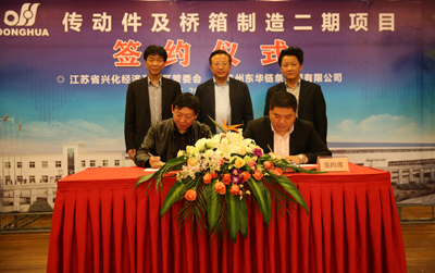 11月14日,東華集團與興化市興化經濟開發區舉行了傳動件及橋箱制造二期項目用地簽約儀式。董事長宣碧華、集團高層、海外公司團隊與興化市副市長、興化經濟開發區黨工委書記李斌、興化經濟開發區管委會主任劉海山、副主任徐玉山及東華興化齒輪有限公司總經理蔣亞龍等共同見證了對東華的發展具有里程碑意義的時刻。