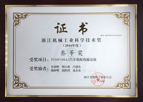 日前,在浙江省機(jī)械工業(yè)聯(lián)合會(huì)四屆四次理事(擴(kuò)大)會(huì)議上傳來(lái)喜訊,東華鏈條集團(tuán)所屬杭州自強(qiáng)鏈傳動(dòng)有限公司開(kāi)發(fā)的“P250F108A2汽車(chē)裝配線輸送鏈”被授予“2016年度浙江機(jī)械工業(yè)科學(xué)技術(shù)三等獎(jiǎng)”,這是東華集團(tuán)產(chǎn)品創(chuàng)新項(xiàng)目連續(xù)五年榮獲浙江機(jī)械科技獎(jiǎng),也是全省機(jī)械領(lǐng)域2016年度51項(xiàng)科技創(chuàng)新成果獎(jiǎng)項(xiàng)中僅有的一項(xiàng)鏈傳動(dòng)產(chǎn)品創(chuàng)新項(xiàng)目。